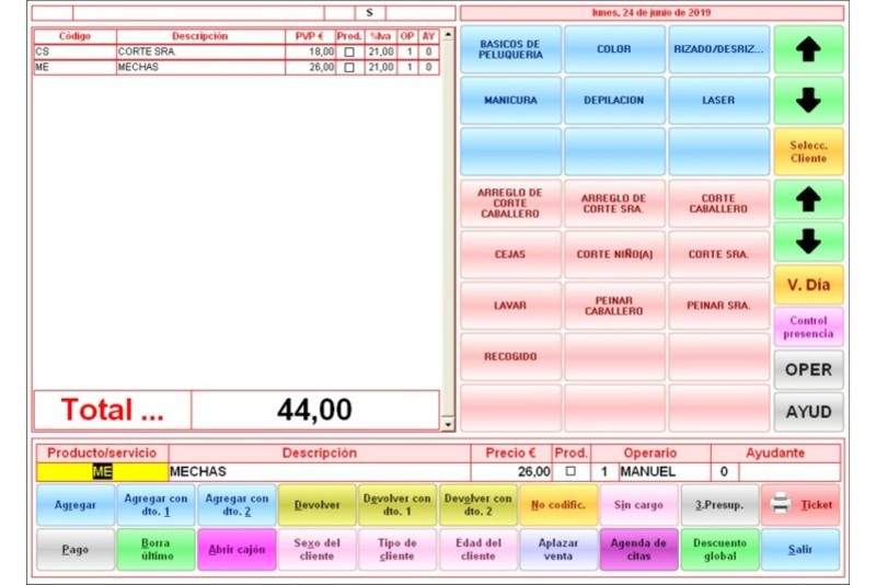Control de Caja: Permite seleccionar servicios y productos mediante pantalla táctil, leer códigos de barras para la venta de productos, elegir al operario responsable del servicio o venta, vender servicios o productos sin codificación, realizar ventas con precios abiertos, programar hasta 2 descuentos por servicio o producto, controlar las entradas y salidas de efectivo (pagos e ingresos bancarios), gestionar las deudas de los clientes, ofrecer diversas modalidades de cobro, realizar arqueos de caja con emisión de informes y generar presupuestos.
