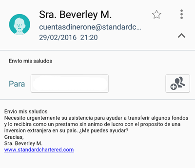 Otro tipo de fraude muy habitual y que lleva años funcionando, es el de solicitar dinero vía mail en diferentes formas, modalidades y mensajes. Uno de los tipos de mail más famosos son las donaciones a Nigeria, enviadas por supuestas mujeres nigerianas solicitando dinero y adjuntando sus fotos para darle más realismo a la historia. En este caso, un correo con remitente femenino, nos habla de transferencias, préstamos sin ánimo de lucro, inversión extranjera... Y cómo no, el enlace para llevar a cabo todo el proceso. |