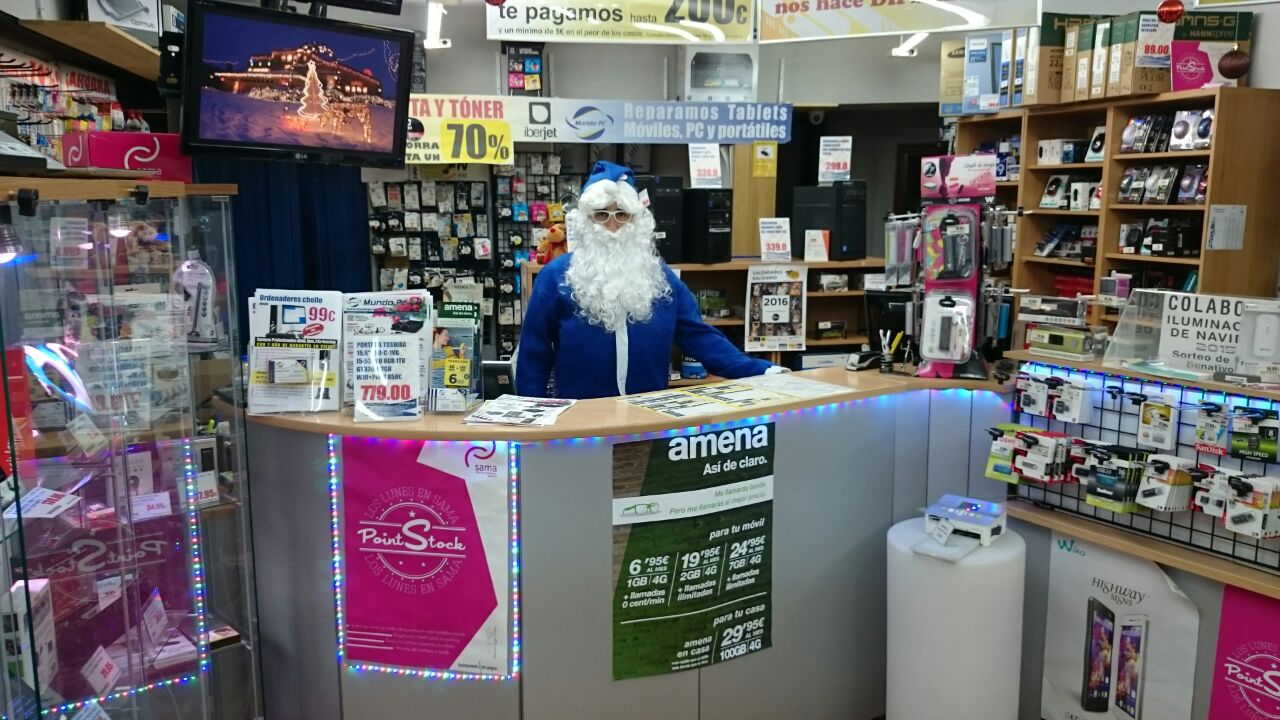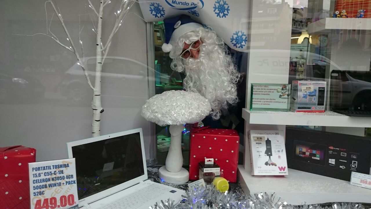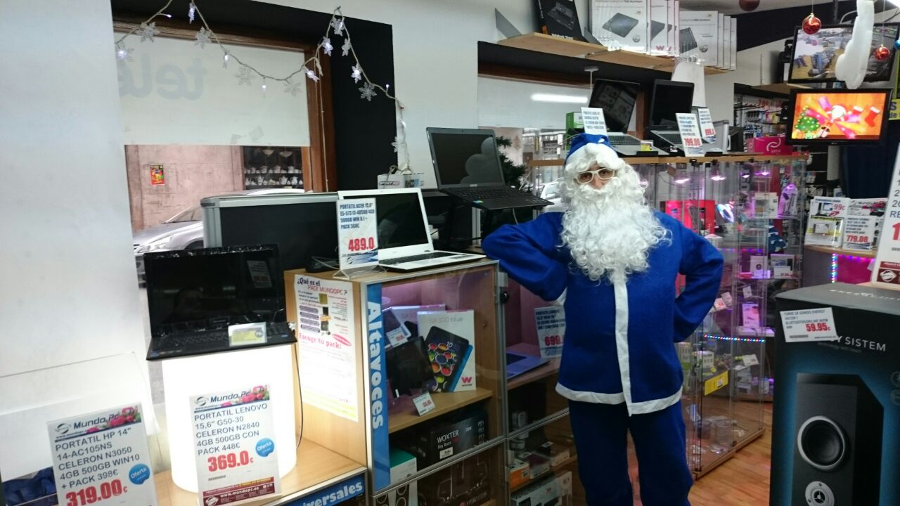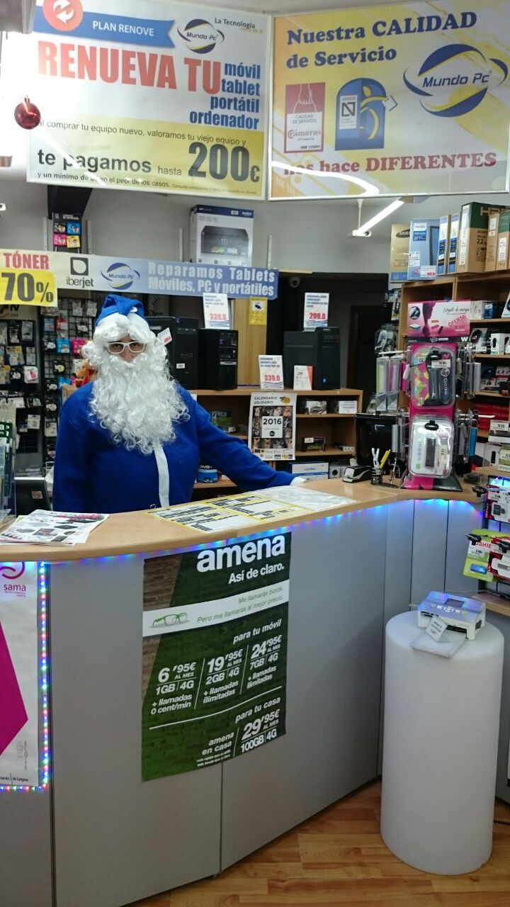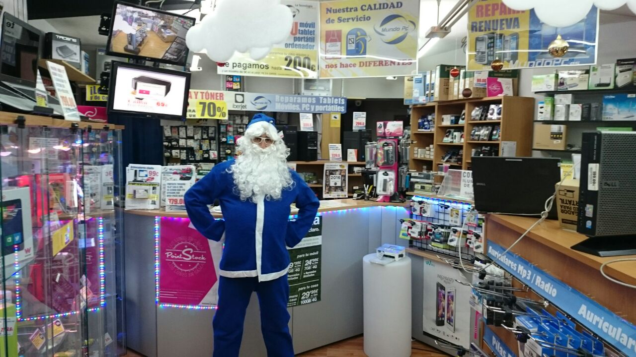 Papá Noel se tiñe de azul en 2015 y se cuela en las tiendas Mundo PC. Consciente de la importancia de la tecnología en la vida cotidiana y del buen servicio posterior que se le dará a los destinatarios de sus regalos, aprovecha para felicitaros la Navidad y un próspero año 2016 desde nuestro mostrador de Sama de Langreo.