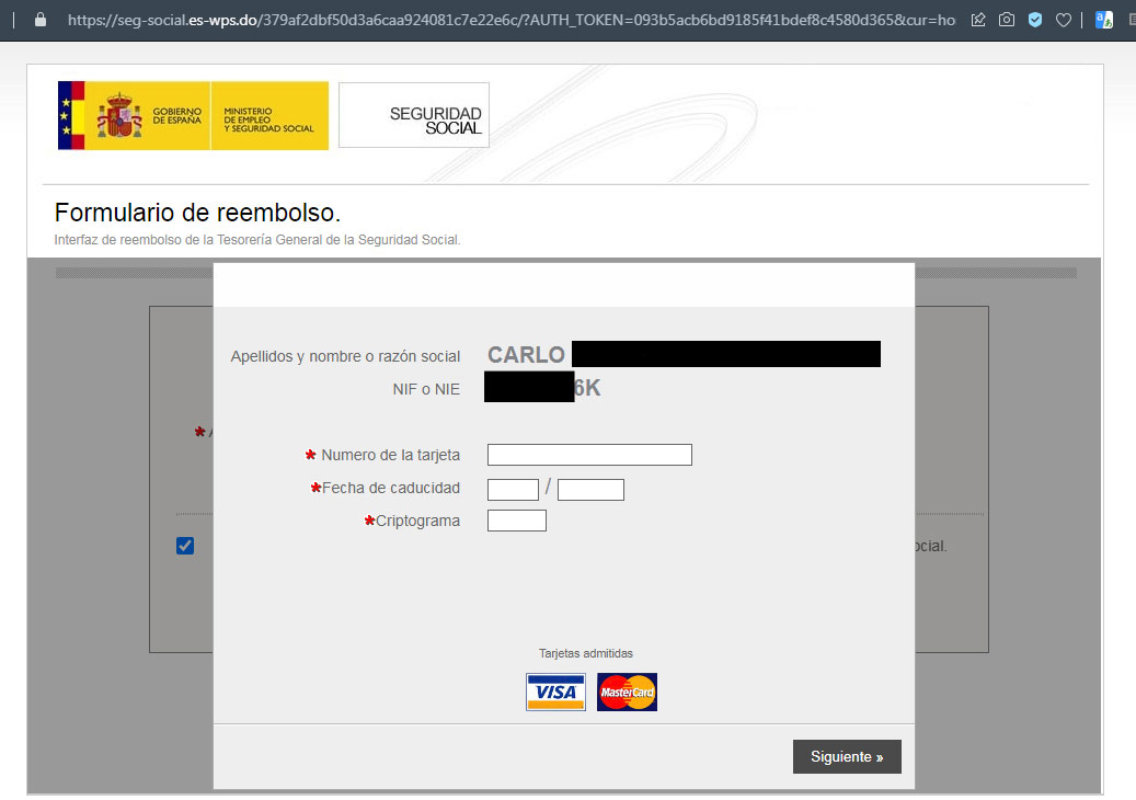 Hemos vuelto a recibir este phishing persistente a nombre del Ministerio de Empleo y Seguridad Social con un falso reembolso de casi 400 euros. A continuación detallamos cada paso del fraude: