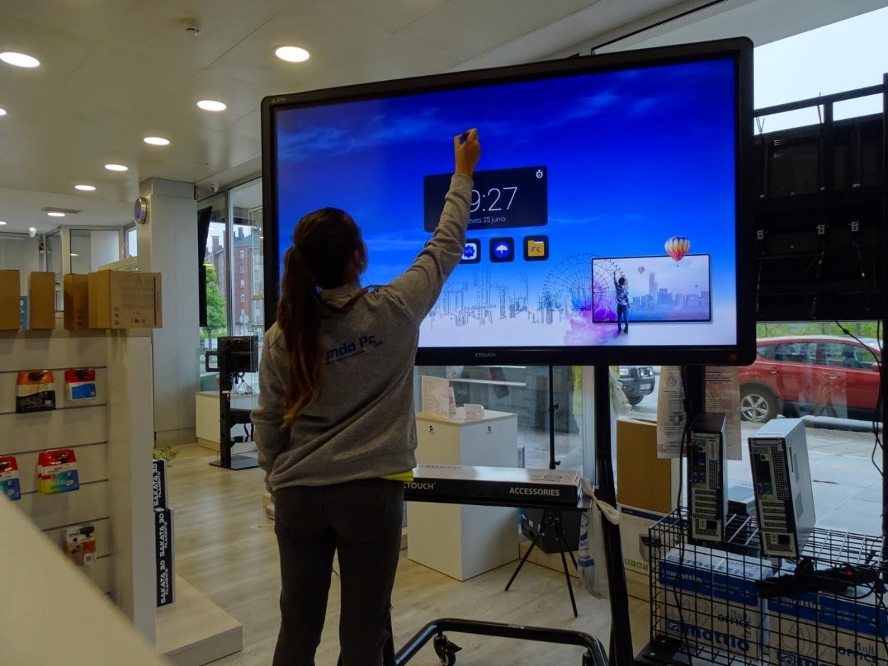 Otra incorporación técnica reciente en la que estamos asesorando y enseñando, principalmente a los colegios e institutos, es la pantalla interactiva multitáctil, que ya está sustituyendo en prestaciones a las actuales pizarras interactivas con proyector, con la ventaja de que aunque tienen un precio algo más elevado, se pueden reutilizar en diversas aulas, gracias a los soportes con ruedas y su gran versatilidad.
